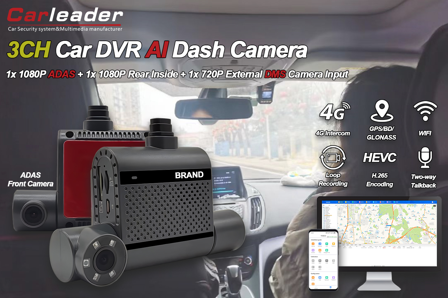 دوربین Dash Carleader 3CH دارای 3 ورودی دوربین است ، می توانید جلو ، داخل و عقب ماشین خود را ضبط کنید. 3 کانال AI ADAS DMS CAR DASH CAM مجهز به ضبط ویدیوی 4G ، GPS و 1080p. نمای جلوی AI Dash Cam با فناوری 1080p ADAS (سیستم کمک رانندگی پیشرفته). 3 کانال AI Dash Cam داخلی 4G ، WiFi ، GPS ، ADAS و DSM. دوربین داشبورد AI با زاویه دید 130 درجه برای دیدن تصویر واضح و ایمن تر کردن رانندگی شما!