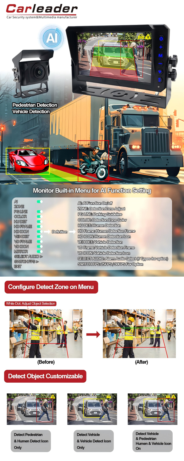 Carleader 7 اینچ AI BSD سیستم مانیتورینگ نقطه کور پشتیبانی کالیبراسیون AI با الگوریتم های پیشرفته هوش مصنوعی با دقت بالا و عملکرد منوی cz کاربر پسند طراحی شده است. این سیستم دوربین هوش مصنوعی هشدارهای دینامیکی عابر پیاده و وسایل نقلیه با دقت بالا را در هر شرایط جوی در اختیار رانندگان قرار می دهد و به طور موثر خطر تصادفات رانندگی را کاهش می دهد. سیستم دوربین مانیتورینگ هوش مصنوعی برای خودروهای شخصی، ناوگان تجاری و وسایل نقلیه ویژه مناسب است. سیستم هوش مصنوعی ناوگان دارای یکپارچگی و سازگاری قوی، دوام و قابلیت نظارت در زمان واقعی است.
