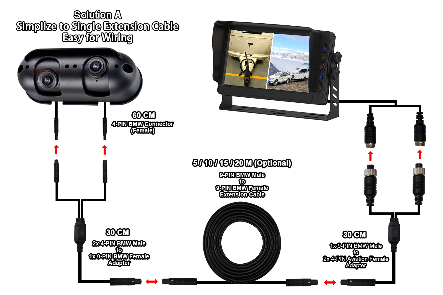 دوربین دید عقب با لنز دوگانه Carleader AHD Starlight مناسب برای موتورخانه RVیک دوربین AHD ابزار خصوصی جدید با کیفیت عالی، یکپارچه با لنز دوگانه در یک دوربین، و زاویه لنز قابل تنظیم به طور جداگانه، که به کاربر اجازه می دهد دید دور و نزدیک را در یک مانیتور مشاهده کند. این دوربین نه تنها برای وسایل نقلیه سنگین مانند کامیون، اتوبوس، لیفتراک و غیره مناسب است. همچنین برای وسایل نقلیه موتوری مانند RV و کاروان مناسب است.