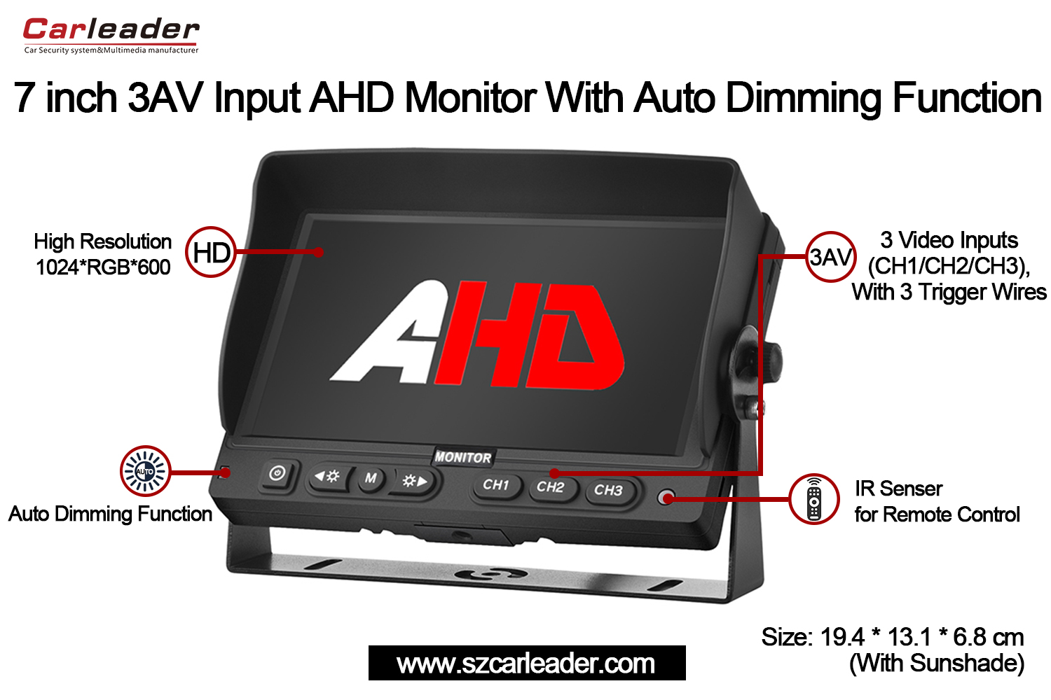 Carleader 7 اینچ مانیتور وسیله نقلیه AHD AHD7 اینچی قوی استمانیتور AHDبرای ادغام یکپارچه در سیستم های نظارتی و خودرو طراحی شده است. با داشتن یک پنل دیجیتال Innolux با نسبت ابعاد 16: 9 ، تصاویر واضح را با وضوح 1024xrgbx600 ارائه می دهد و از وضوح برای برنامه های مهم اطمینان می دهد. همچنین دارای 3 کانال ورودی ویدیویی AHD است که متناسب با بسیاری از نیازهای بینایی خودرو است.