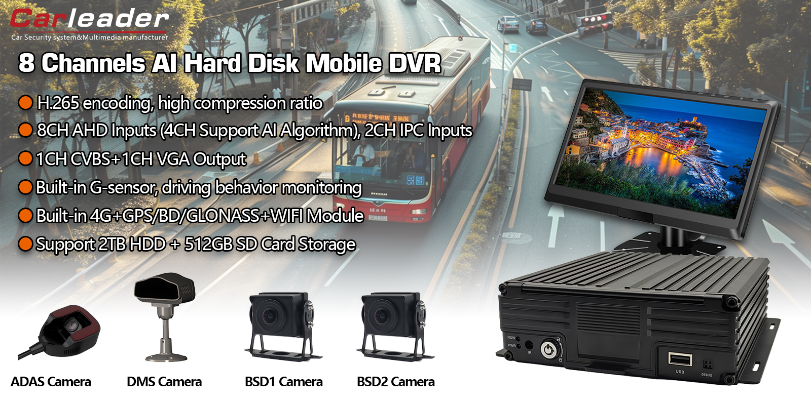 کارلیدر8CH AI HDD موبایل DVR پشتیبانی از ADAS+DMS+BSDراه حل عالی برای ناوگان تجاری، حمل و نقل عمومی، تدارکات و وسایل نقلیه ویژه است که نیاز به: