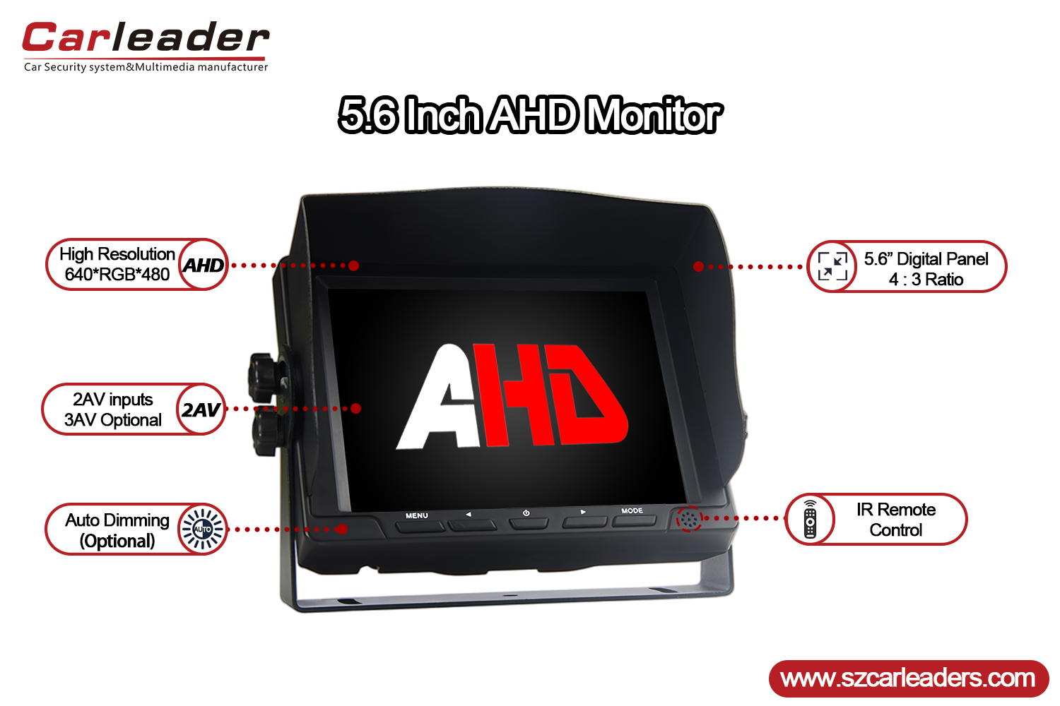کارلیدر5.6 اینچ 2CH AHD ورودی مانیتور پشتیبان خودروایده آل برای کامیون ها، اتوبوس ها، RVs، و هر وسیله نقلیه ای که در آن دید عقب و ایمنی افزایش یافته در اولویت هستند. ساختار بادوام، صفحه نمایش شفاف و ویژگی های کاربردی آن را به یک جزء قابل اعتماد برای سیستم های دوربین خودروهای مدرن تبدیل کرده است.