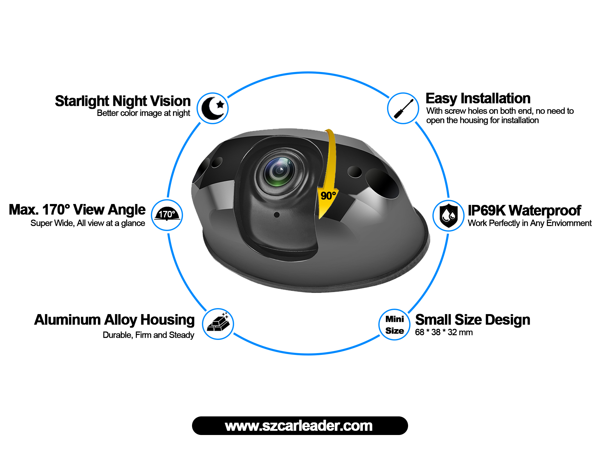 دوربین پشتیبان سنگین ضد آب با زاویه دید عریض 170 درجه AHD تصویری واضح در زمان واقعی را در طول فرآیند رانندگی در اختیار راننده قرار می دهد. زاویه فوق العاده بزرگ آن تا 170 درجه، بیشتر برای راننده برای ارائه طیف گسترده ای از نظارت، به طوری که راننده می تواند محیط اطراف وسیله نقلیه را بدون هیچ نقطه کور نظارت کند.