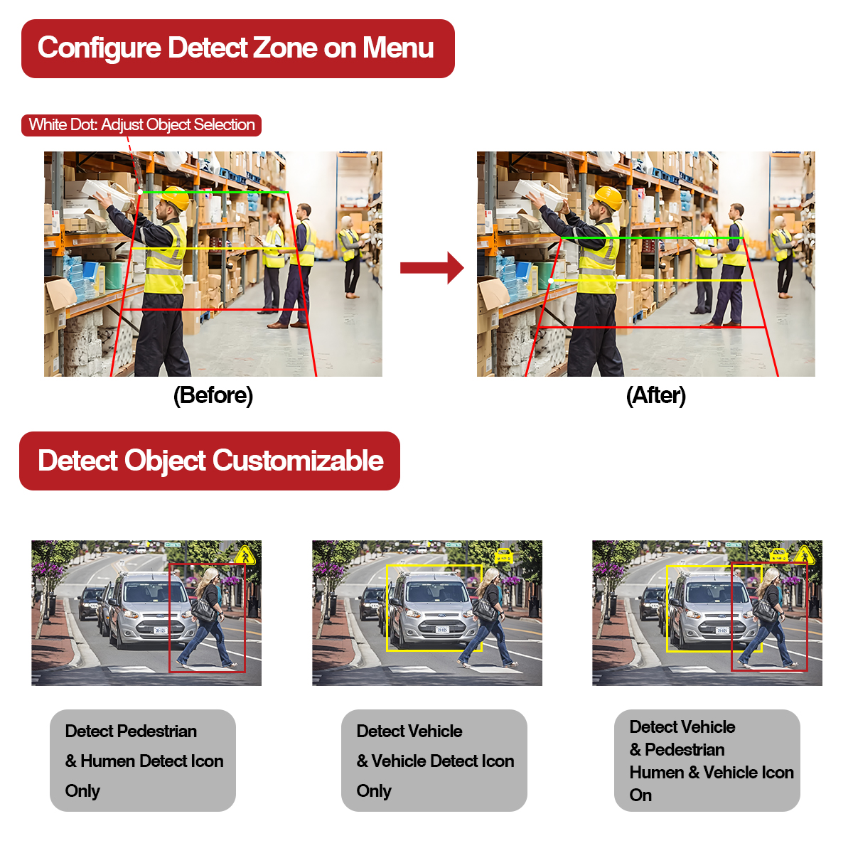 این دوربین هوش مصنوعی با عملکرد نور هشدار داخلی، رنگ نور به رنگ مربوطه تغییر میکند زمانی که شی شناسایی وارد مناطق تشخیص مختلف (قرمز، زرد، سبز) شود. همچنین با زنگ هشدار برای عابر پیاده و وسیله نقلیه ای که به وسیله نقلیه شما نزدیک می شوند، هشدار دهید.