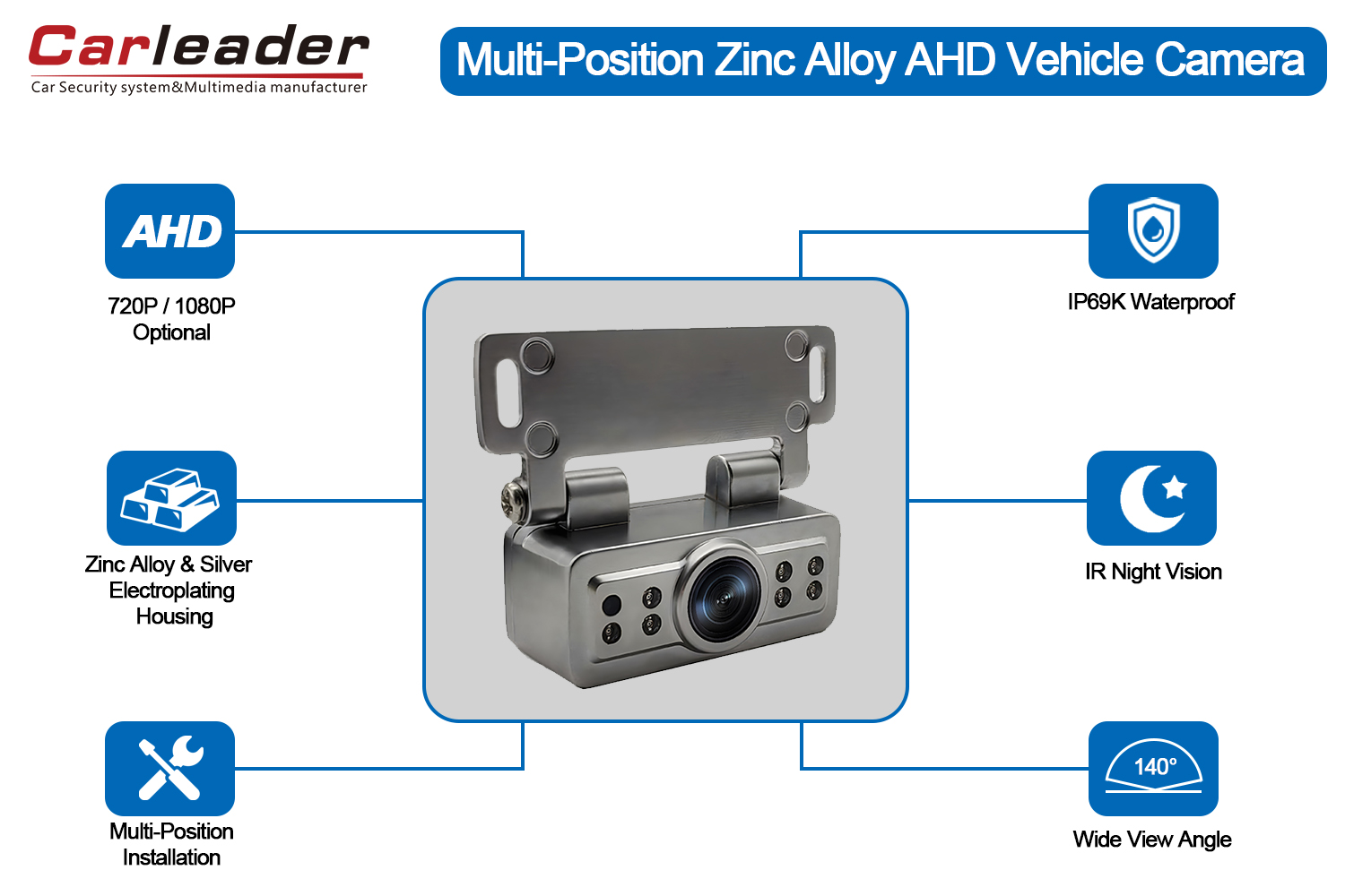 کارلیدردوربین دنده عقب خودرو آبکاری نقره ای AHDبا بدنه آلیاژ روی و آبکاری نقره، زاویه دید وسیع 140 درجه و ضد آب و گرد و غبار IP69K. زاویه و موقعیت نصب را می توان با پیچ نیز ثابت کرد.