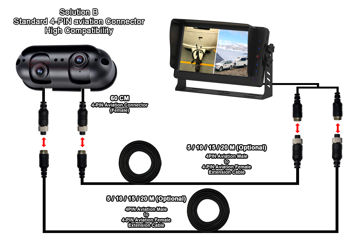 کارلیدردو راهحل سیمکشی مختلف را برای دوربین دید عقب با لنز دوگانه AHD Starlight برای موتورخانه RV ارائه میکند تا نیازهای مختلف سیمکشی را برآورده کند: