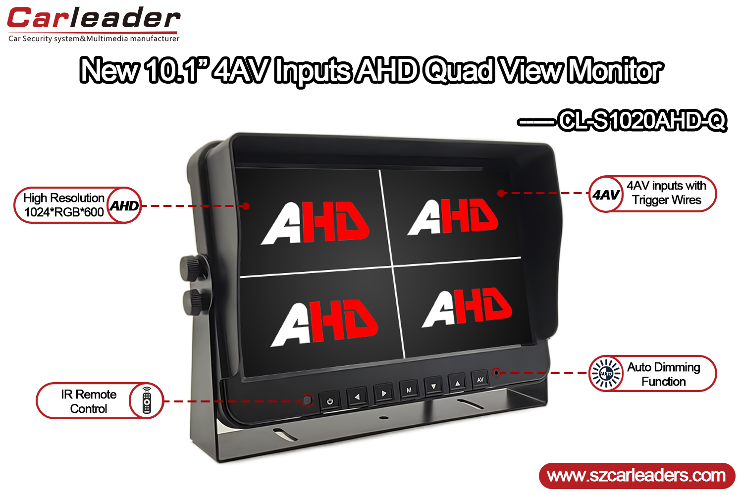 ایده آل برای وسایل نقلیه، امنیت و برنامه های نظارت صنعتی،مانیتور 10.1 اینچی Carleader 4CH 4CH Heavy Duty Vehicle مانیتور AHDترکیبی از عملکرد قوی، کیفیت صفحه نمایش واضح و گزینه های قابل تنظیم توسط کاربر در یک بسته جمع و جور و بادوام.