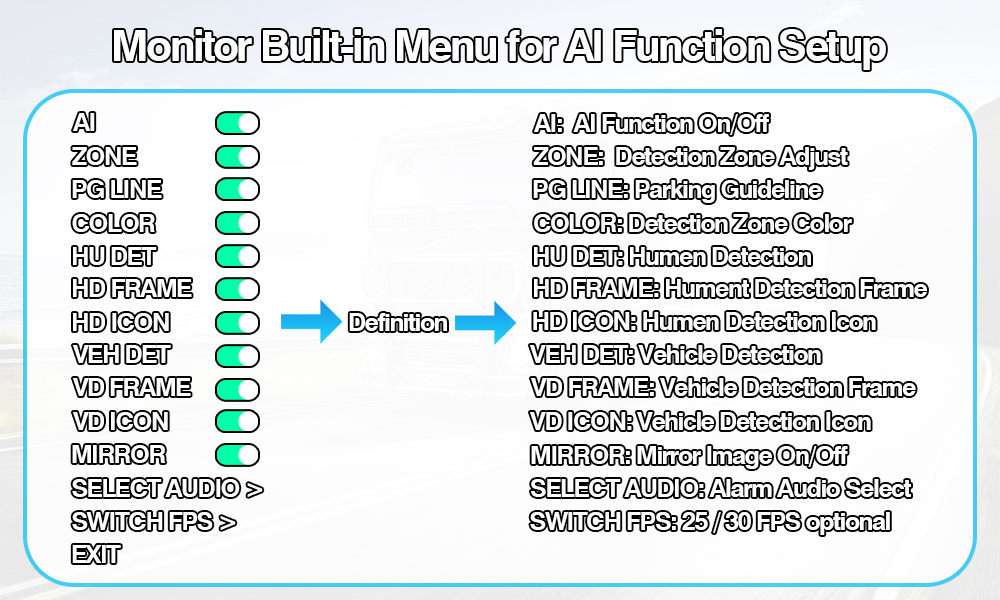 کالیبراسیون هوش مصنوعی قابل تنظیم: به راحتی مناطق تشخیص هوش مصنوعی را از طریق منوی بصری روی صفحه نمایشگر تنظیم کنید، همچنین می توانید انتخاب کنید که فقط عابران پیاده، فقط وسایل نقلیه یا هر دو را تحت نظر داشته باشد — با تشخیص روشن/خاموش قابل انتخاب روکش های قاب و نماد شی (عابر پیاده یا وسیله نقلیه) برای بازخورد بصری واضح.